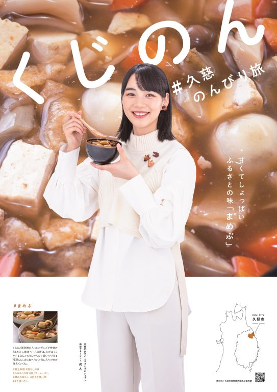 本プロジェクトのために、久慈市の「海」「白樺美林」「久慈産琥珀」「まめぶ」をテーマにしたポスターや、のんのパネルが作られました。